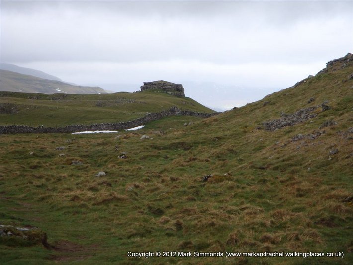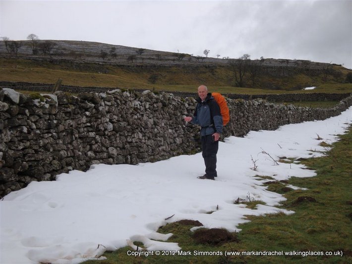 Everything re-packed, we reached some snow. It was surprising how much was left bearing in mind all the rain, but generally it was where it had drifted, up against walls and so on. The rain had eased and we could at least take our hoods off, so not quite as claustrophobic. We met some sheep which were very inquisitive and came running over to us but unfortunately we had nothing for them. Soon after we passed a lime kiln and then a very deep gully shortly followed by the rock that is Conistone Pie, and it did, look like a pie.