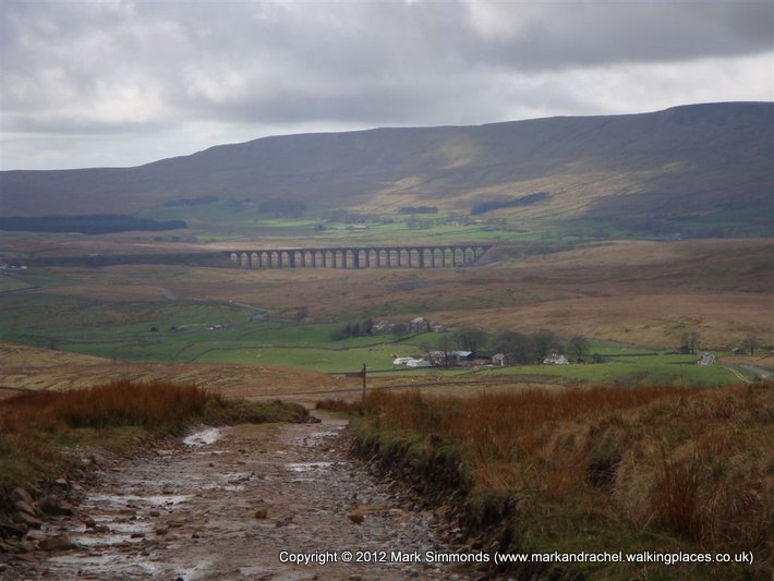 The view back down the valley was great but it had taken us 2 hours to do perhaps 3.5 miles which was shocking. We could see Pen-y-Ghent and Ingleborough mountains as we panned around, but it was bitterly cold, so we set off once more, and at least we were on a decent trackand down hill. As we rounded a bend we could see Ribblehead viaduct in the distance, which I assumed was Dent Head initially, but after checking the map realised my mistake. The skies were jet black and threatening all around us but they passed us by, leaving us dry. We arrived at Gayle Beck where the water was very high so we crossed by the bridge rather than the ford.