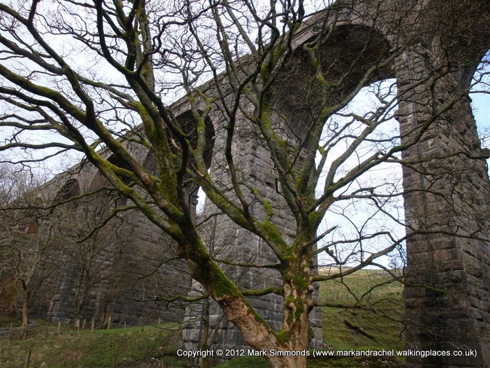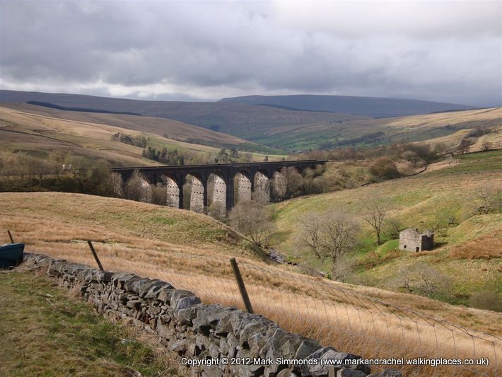 Parts of the track were waterlogged but on the whole not too bad and we picked up some speed. The food had already started to give us a lift, whether it was mental or physical we didn’t care, it had done the trick. We reached the road and shortly saw the Dent Head Viaduct slightly below us, along with Dent station high on the moor in the distance. As we were standing there, a train passed over the viaduct and I could just make out a train leaving the station, through the camcorder’s zoom. We walked along the road which would now be our companion for the rest of the day. Although harder on the feet it was a welcome change to the quagmire that we had passed through previously. The road took us under the railway and then steeply down to the base of the viaduct where the scale could really be appreciated. We continued downhill until we met the infant River Dee which ran parallel to the road. The river was a torrent due to the rain but this isn’t always the case, as we would find out the next morning.