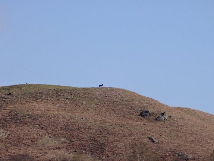The track wound its way to the Falls of Falloch where we stopped for a short while and took some photos. Looking up we saw a deer silhouetted on the skyline, across the valley. We zoomed in through the view finder and yes there it was, our first deer of the walk. We carried on until Derrydaroch where we saw some walkers setting off for one of the summits off to the east. Just passed the farm we decided to stop alongside the river. Just as we had decided to stop, who should we bump into but Sigi and Ulle. They had stopped at a very nice spot which we would have stopped at had they not beaten us to it. They had obviously got up earlier than us and got their towels there before us!